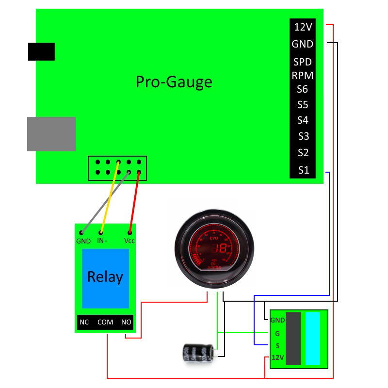 - The black capacitor has one pin longer than the other. The longer pin must be connected to the GREEN wire of the gauge. The shorter pin to the black one. Don't invert the pins or the capacitor could explode.