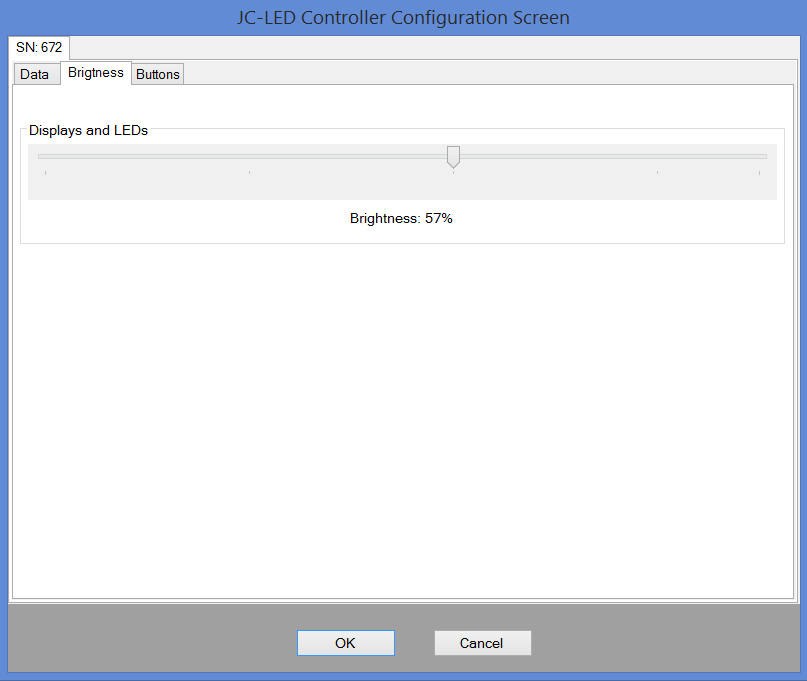 The Brightness section (above) of the configuration screen allows you to adjust the brightness of the displays and leds connected to the JC-LED. There are 8 positions available.