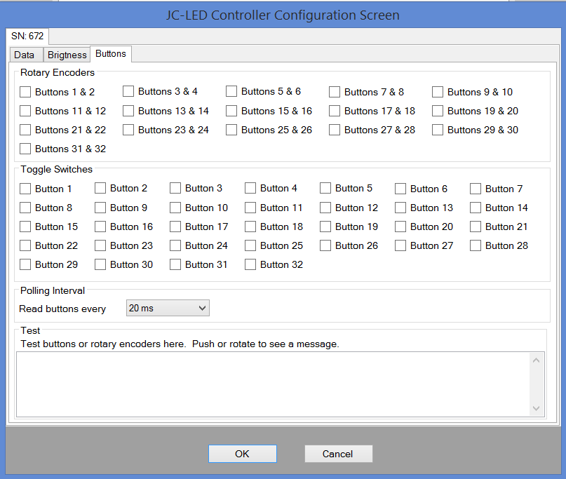 It is also possible to set how often the state of buttons/switches/rotary encoders is read by the JC-LED. Usually 20ms is fine if you have connected only push buttons and toggle switches. Rotary encoders might require a short interval, if you want to be able to rotate the rotary encoder quicker and not loose reading. In general, the higher the interval the better, to avoid contact bouncing.