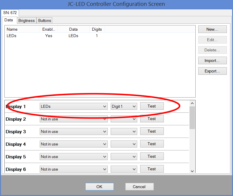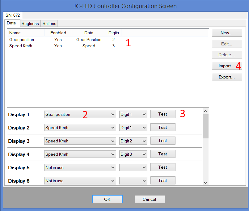 - 3 is a TEST button. If you click the button the corresponding display or group of leds will switch on. This function is useful when you want to check that a display of group of leds is connected to the JC-LEd correctly.