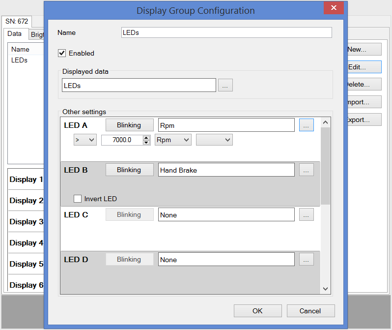 - Now the configuration screen should be like in the picture below. Now you can configure one LED as the shift light and one as the hand brake warning. I decided to use LED A and LED B.