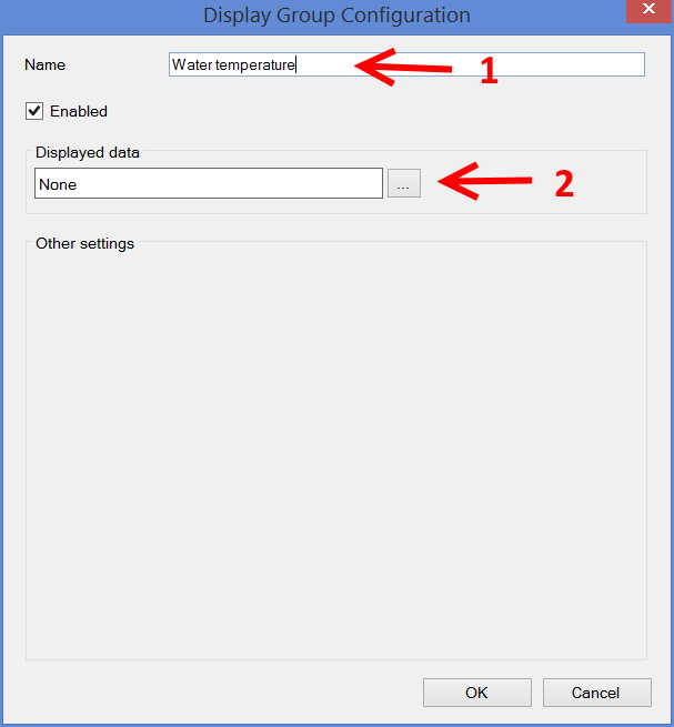 - Referring to the picture below, put a name in the textbox highlighted by arrow 1. It can be any text but it is easier if it describes the data value being displayed. Click the button highlighted by arrow 2 to select the data to display (water temperature in our case).
