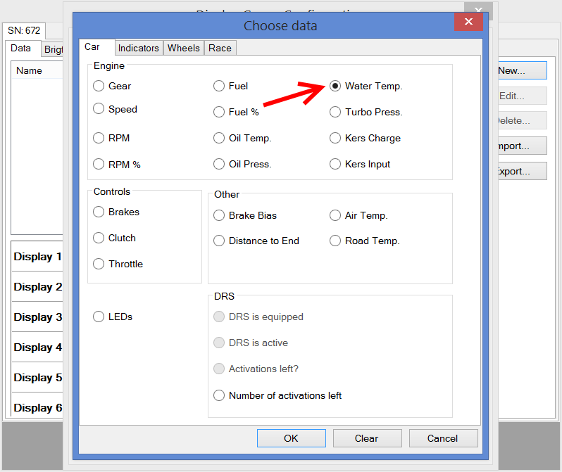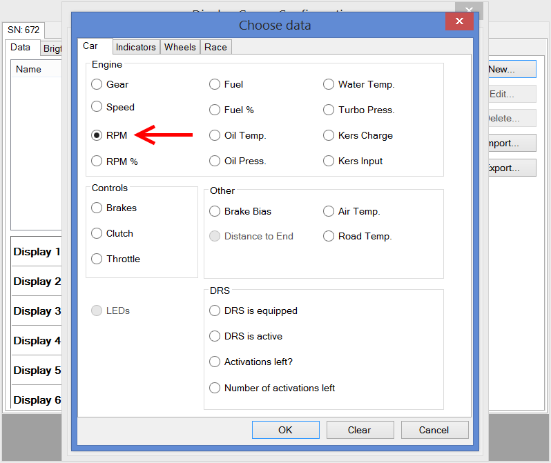 - Click the two buttons highlighted in the picture above and choose what data LED A and LED B will be associated with. Choose RPM for LED A and Hand Brake for LED B.
