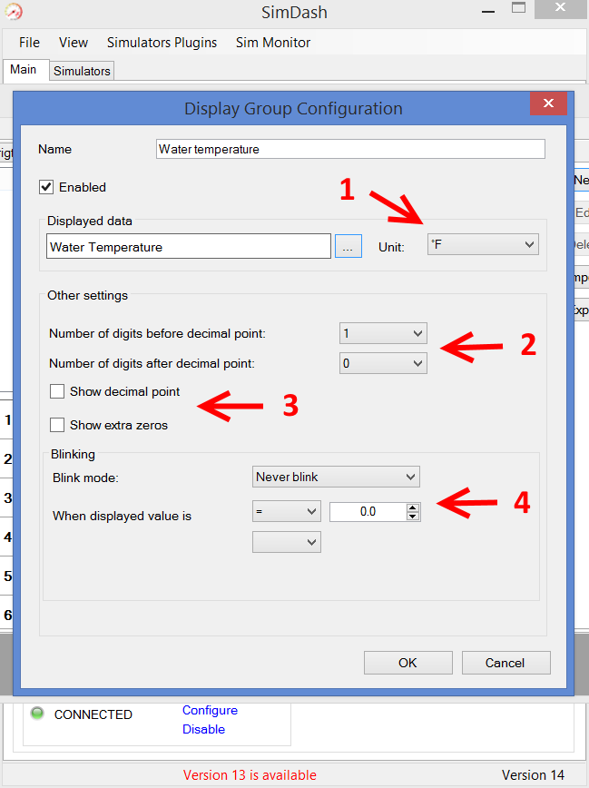- (2) highlights two drop down lists. The first one sets the number of figures before the decimal point, the other one is the number of figures after. In our case we want three figures before the decimal point and one after. So the displayed water temperature will be something like 123.4