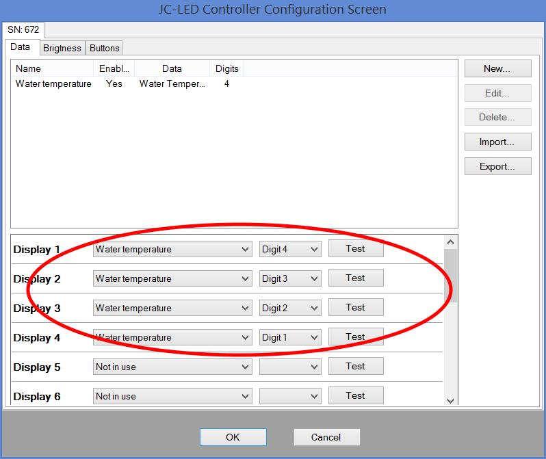 - Now that we have configured the water temperature read-out and in particular we have configured it to use four displays (three before and one after the decimal point) we have to assign each of the four digits of the water temperature value to some of the 7-segment displays that are connected to the JC-LED controller. In the picture below digit n.4 (the leftmost digit of the water temperature value) is assigned to display n.1. Digit n.1 (the rightmost digit of the water temperature value, that is the digit after the decimal point) is connected to display n.4
