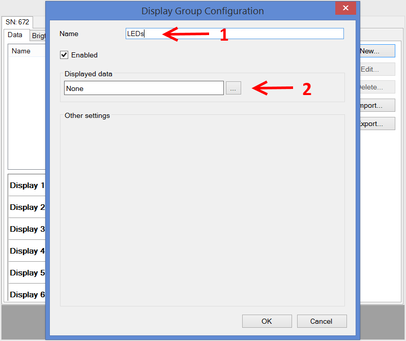 - Open the JC-LED configuration screen and click the New... button. The dialog shown below will appear. Put a name in the Name textbox and click the button highlighted by the red arrow 2.