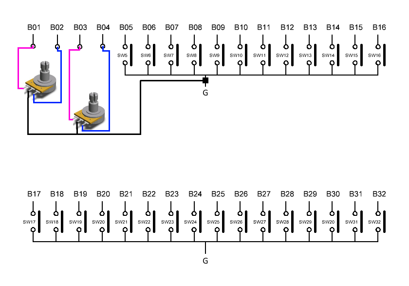 Each push button connects to a B1...B32 pin and to one of the G pins (there are nine G terminals on the board and each of them can be connected to multiple push buttons).