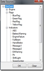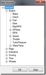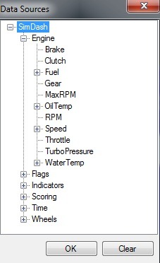 - Data source: this property is very important and will be used very often. The data source of a widget is the data item that will be displayed. It can be the speed of the car, the gear position, the current lap time and so on. To select a data source, click the property and select the desired data item from the dialog. To remove the data source from a widget, open the data sources dialog again and click the Clear button.
